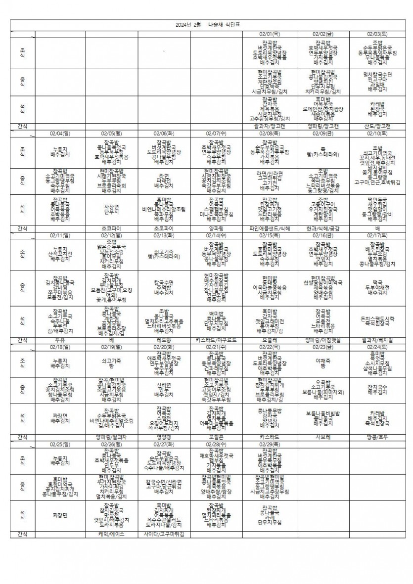 2024년 2월 식단표 페이지 정보 작성자 나솔채 댓글 0건 조회 305회 작성일 24-03-30 15:16 목록 본문 2024년 2월 식단표 댓글 0 댓글목록 등록된 댓글이 없습니다.