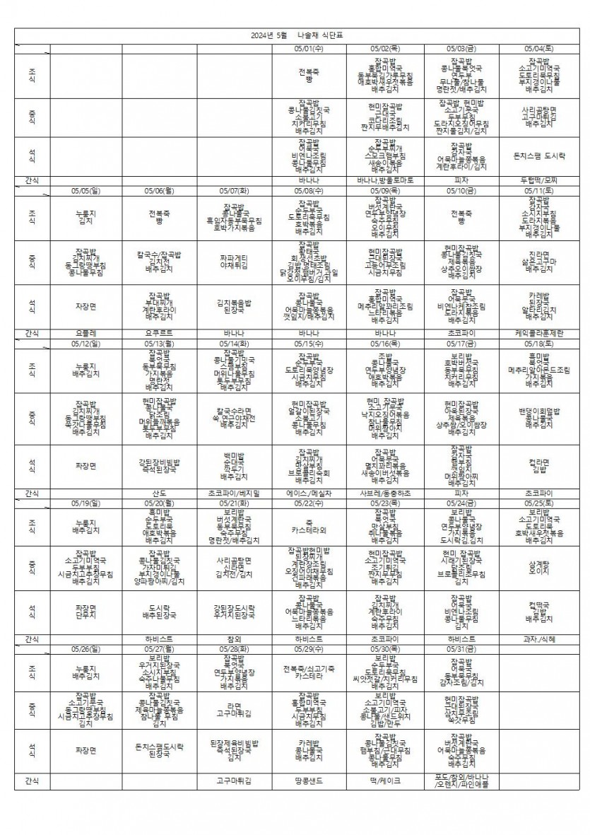 2024년 5월 식단표 페이지 정보 작성자 나솔채 댓글 0건 조회 286회 작성일 24-06-04 16:37 목록 본문 2024년 5월 식단표 입니다 댓글 0 댓글목록 등록된 댓글이 없습니다.