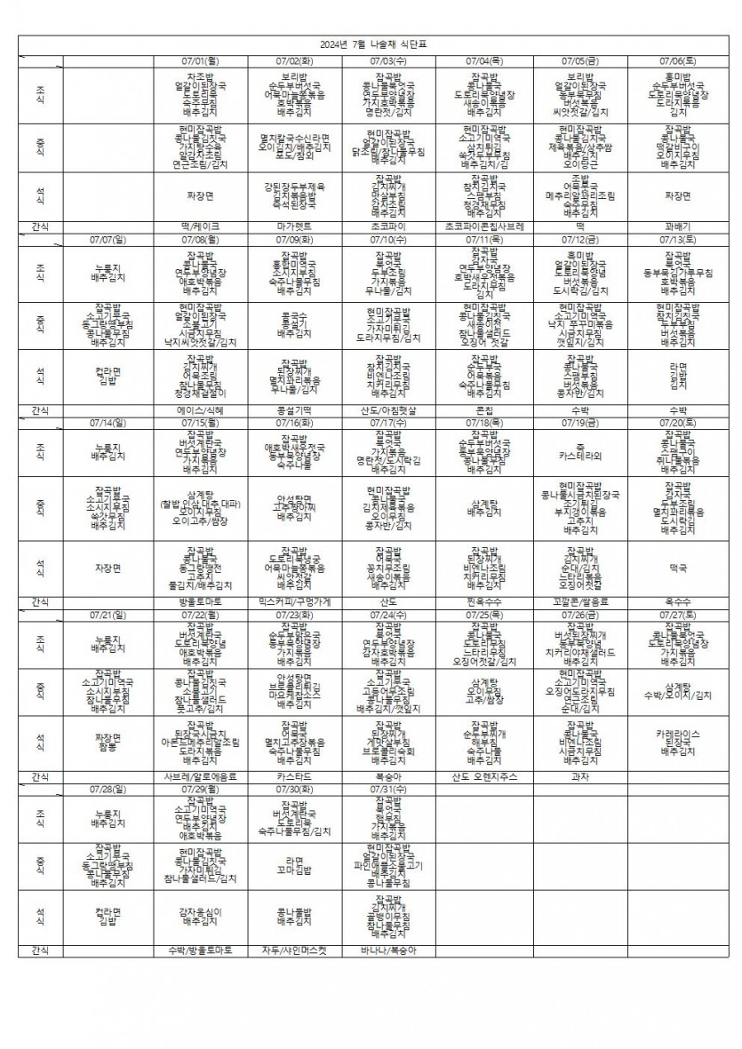 2024년 7월 식단표 페이지 정보 작성자 나솔채 댓글 0건 조회 232회 작성일 24-08-01 17:07 목록 본문 2024년 7월 식단표 댓글 0 댓글목록 등록된 댓글이 없습니다.