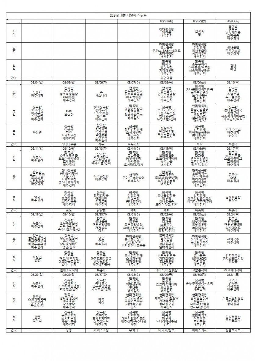 2024년 8월 식단표 페이지 정보 작성자 나솔채 댓글 0건 조회 226회 작성일 24-08-31 14:54 목록 본문 2024년 8월 식단표 댓글 0 댓글목록 등록된 댓글이 없습니다.