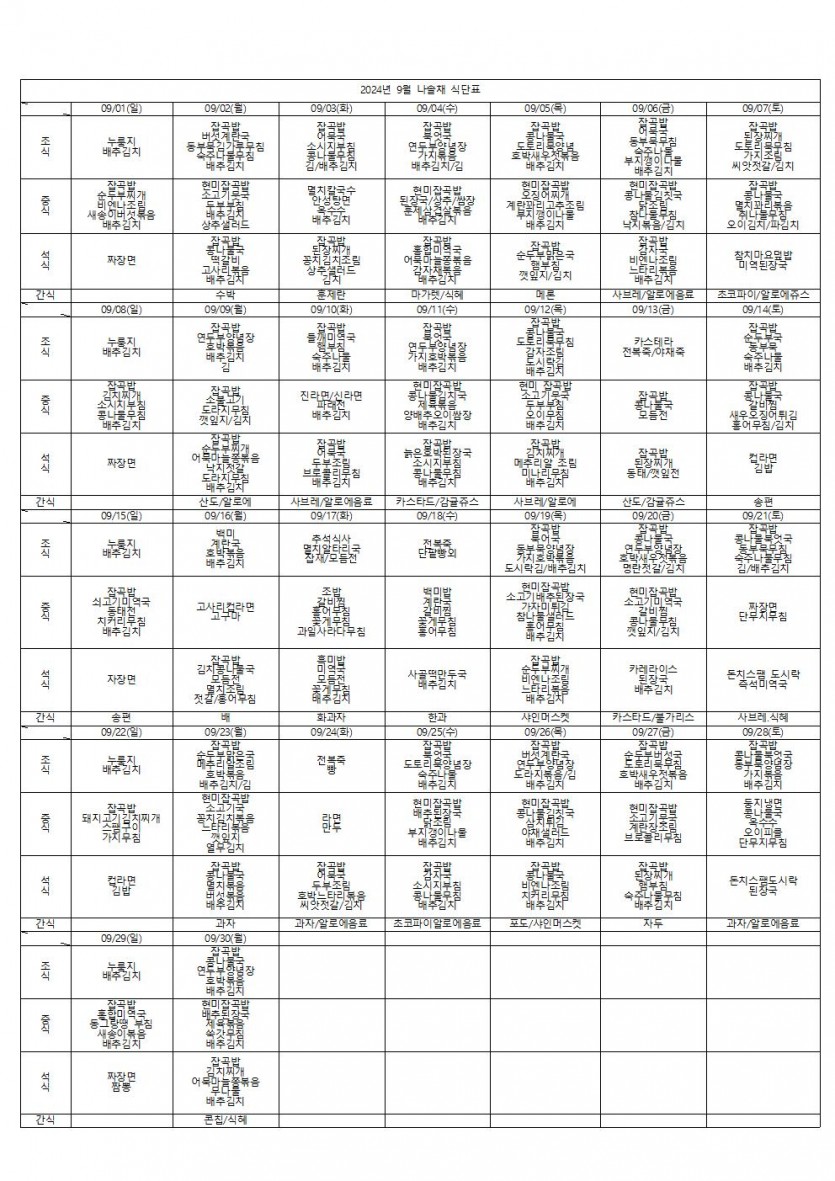 2024년 9월 식단표 페이지 정보 작성자 나솔채 댓글 0건 조회 202회 작성일 24-09-28 13:38 목록 본문 2024년 9월 식단표 댓글 0 댓글목록 등록된 댓글이 없습니다.