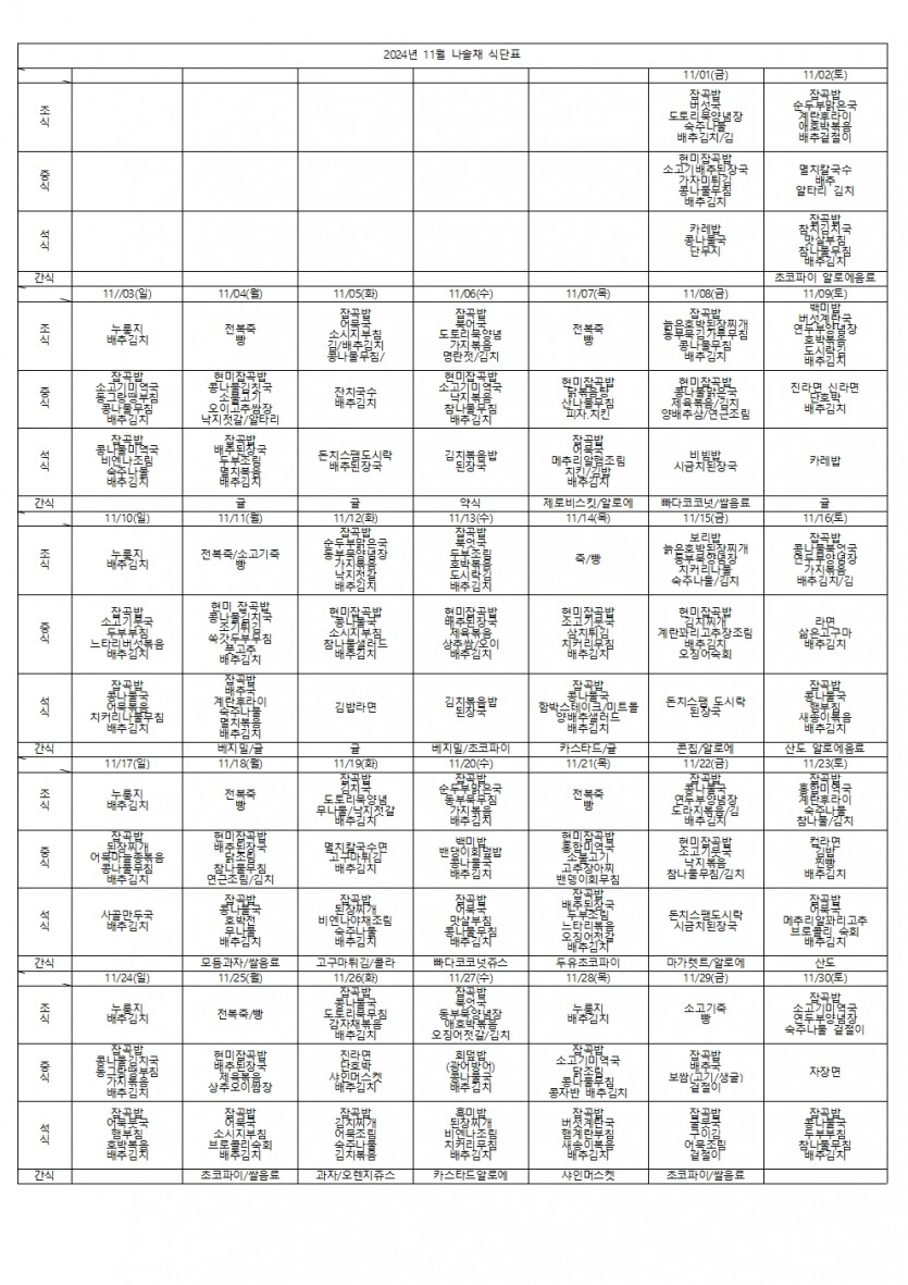 2024년 11월 식단표 페이지 정보 작성자 나솔채 댓글 0건 조회 169회 작성일 24-12-09 16:47 목록 본문 2024년 11월 식단표 댓글 0 댓글목록 등록된 댓글이 없습니다.