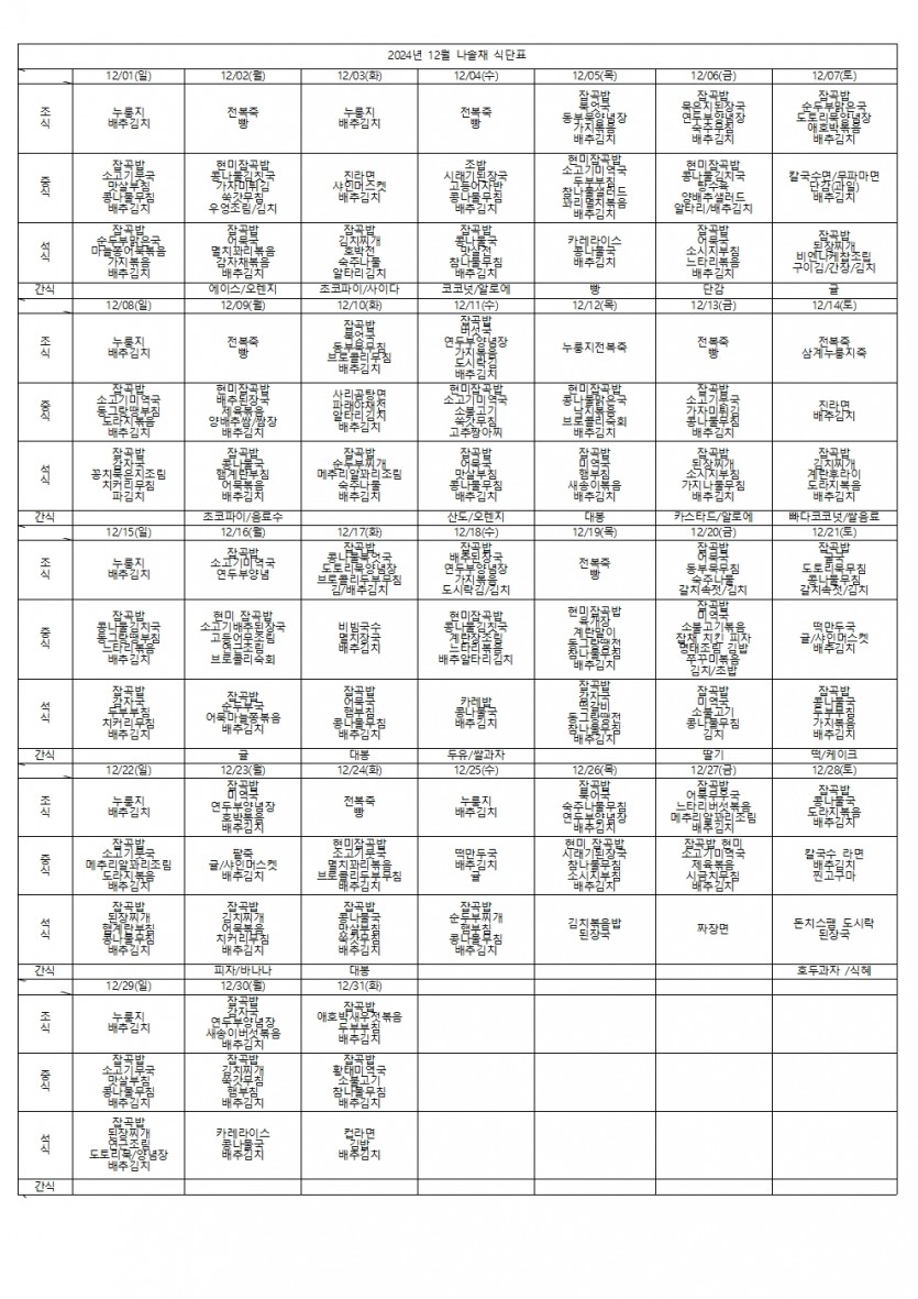 2024년12월 식단표 페이지 정보 작성자 나솔채 댓글 0건 조회 158회 작성일 25-01-10 10:58 목록 본문 2024년12월 식단표 댓글 0 댓글목록 등록된 댓글이 없습니다.