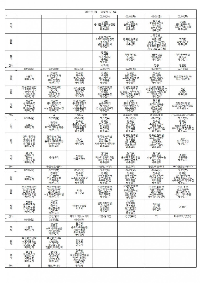 2023년 2월 식단표 페이지 정보 작성자 나솔채 댓글 0건 조회 369회 작성일 23-03-03 10:10 목록 본문 2023년 2월 식단표입니다 댓글 0 댓글목록 등록된 댓글이 없습니다.