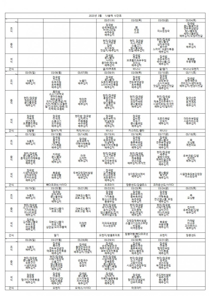 2023년 3월 식단표 페이지 정보 작성자 나솔채 댓글 0건 조회 383회 작성일 23-03-31 11:55 목록 본문 2023년 3월 식단표입니다 댓글 0 댓글목록 등록된 댓글이 없습니다.
