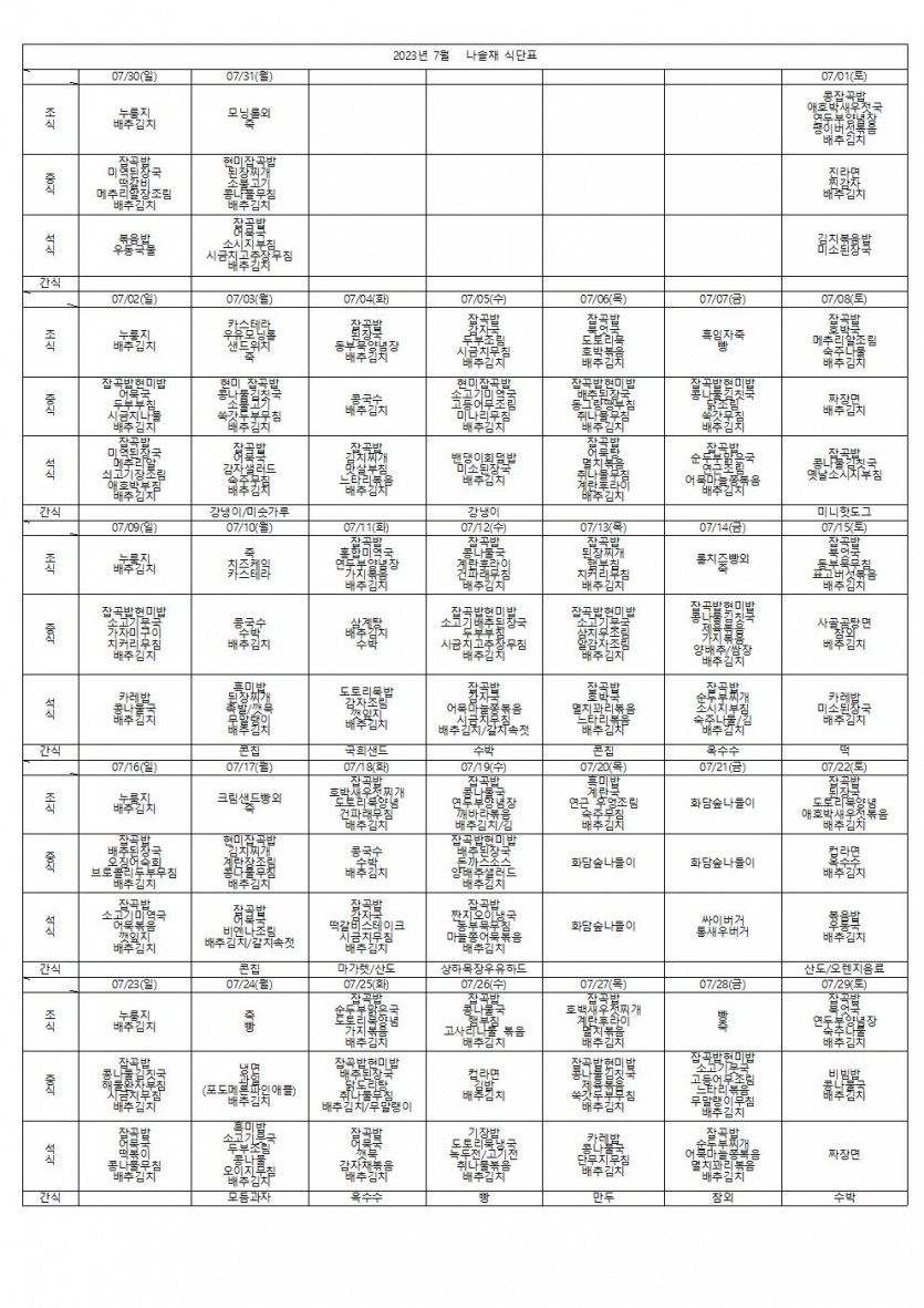 2023년 7월 식단표 페이지 정보 작성자 나솔채 댓글 0건 조회 360회 작성일 23-07-31 09:51 목록 본문 2023년 7월 식단표 댓글 0 댓글목록 등록된 댓글이 없습니다.