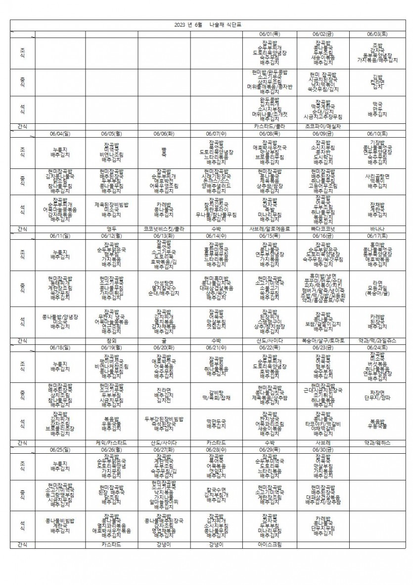 23년 6월식단표 ♥ 페이지 정보 작성자 나솔채 댓글 0건 조회 285회 작성일 23-11-06 13:19 목록 본문 23년 6월식단표입니다 ♥ 댓글 0 댓글목록 등록된 댓글이 없습니다.