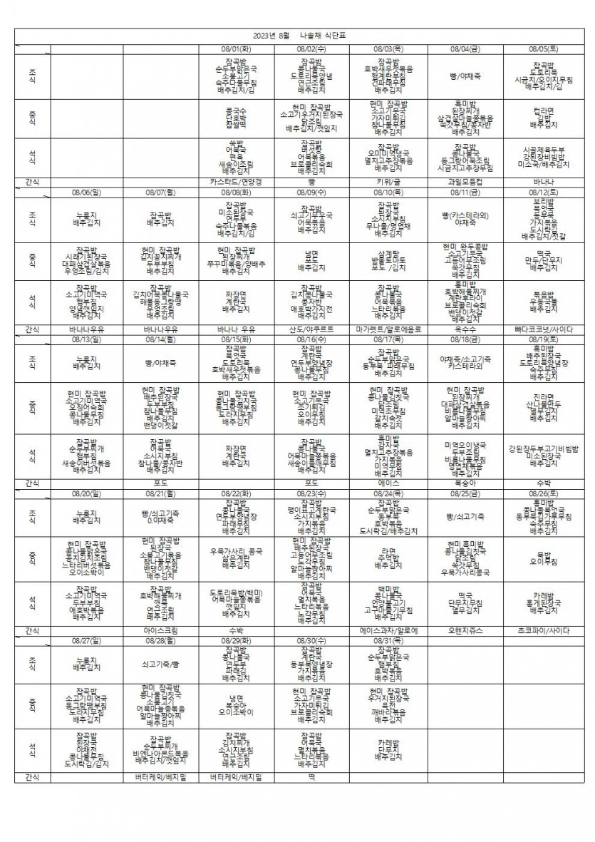 23년 8월식단표 ♥ 페이지 정보 작성자 나솔채 댓글 0건 조회 283회 작성일 23-11-06 13:20 목록 본문 23년 8월식단표 입니다 댓글 0 댓글목록 등록된 댓글이 없습니다.