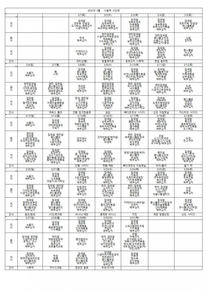 2022년 3월 나솔채 식단표 페이지 정보 작성자 나솔채 댓글 0건 조회 467회 작성일 22-05-12 09:26 목록 본문 2022년 3월 나솔채 식단표 댓글 0 댓글목록 등록된 댓글이 없습니다.