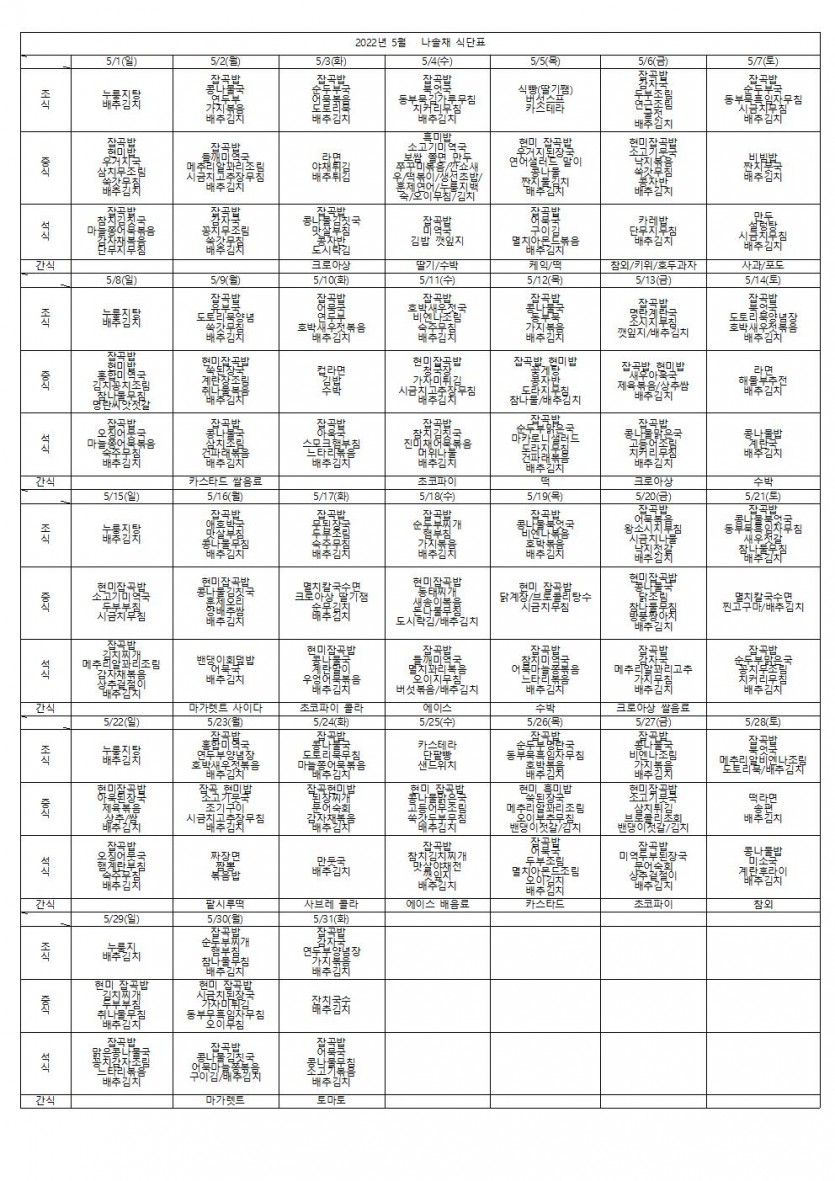 2022년 5월 나솔채 식단표 페이지 정보 작성자 나솔채 댓글 0건 조회 433회 작성일 22-05-31 11:50 목록 본문 2022년 5월 나솔채 식단표 입니다 댓글 0 댓글목록 등록된 댓글이 없습니다.