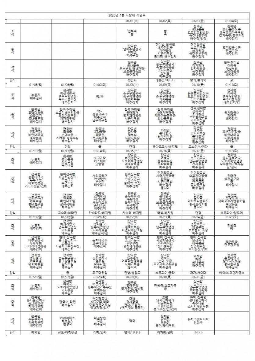 2025년 1월 식단표 페이지 정보 작성자 나솔채 댓글 0건 조회 165회 작성일 25-02-03 17:45 목록 본문 2025년 1월 식단표 댓글 0 댓글목록 등록된 댓글이 없습니다.