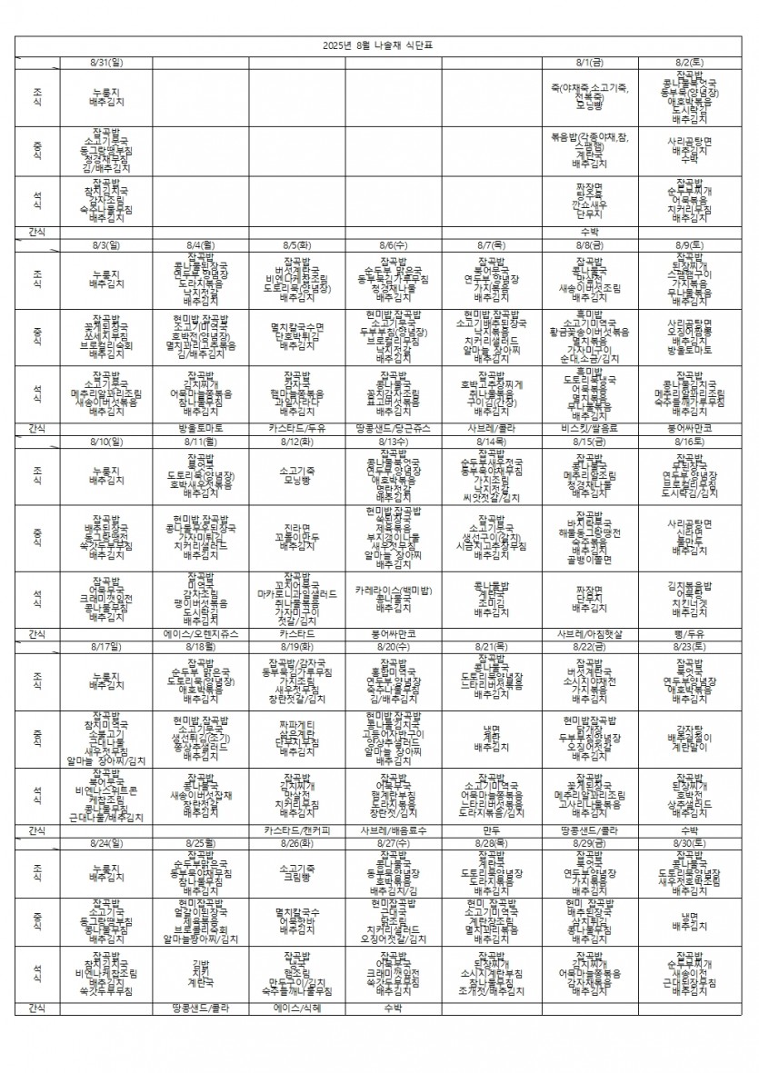2025년 8월 식단표 페이지 정보 작성자 나솔채 댓글 0건 조회 74회 작성일 25-08-28 11:49 목록 본문 2025년 8월 식단표 댓글 0 댓글목록 등록된 댓글이 없습니다.