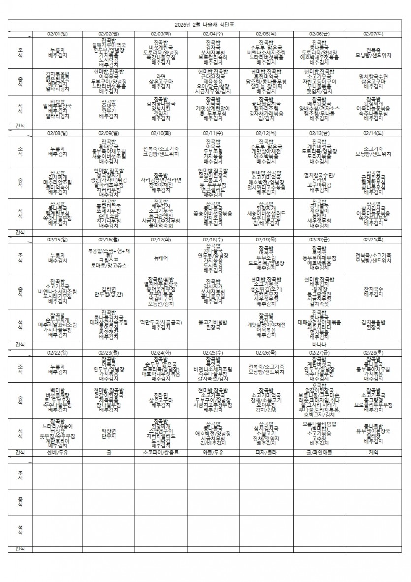 2026년 2월 식단표 페이지 정보 작성자 나솔채 댓글 0건 조회 25회 작성일 26-03-03 10:32 목록 본문 2026년 2월 식단표 댓글 0 댓글목록 등록된 댓글이 없습니다.